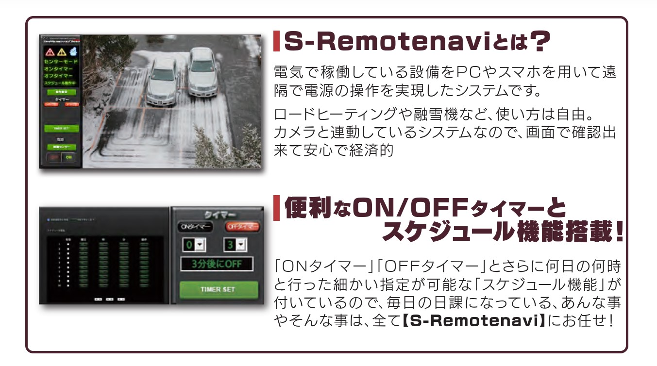 S-REMOTENAVIとは、ロードヒーティングなど電気で稼働している設備にカメラを連動させ、サーバーを通して情報管理をしていくシステムです。